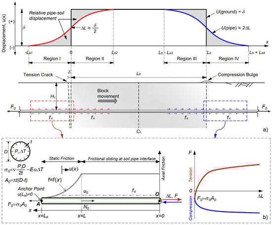Evidently, the region of the soil–pipeline system beyond the soil block behaves like a pull-out test under tension (region I) and compression (region IV), with the end displacement (ΔL) applied at the pipe points underlying the tension crack and compression bulge, respectively (Figure 3a). The total pipeline elongation at each side of the soil block head i.e., in region I (Up1) and region II (Up2), is equal to the magnitude of the overall pipeline contraction at each side of the toe of the sliding block, i.e., in region III (Up3) and region IV (Up4).