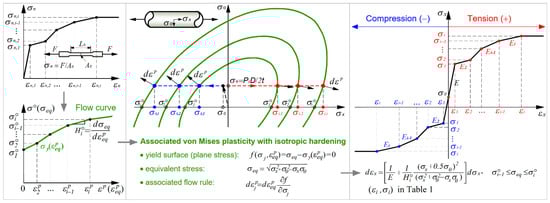 Herein, the pipe material is assumed to have a piecewise stress–strain curve, defined by the engineering strain–stress values (εi, σi), either in tension (ε > 0) or in compression (ε < 0), where Ei = (σi − σi−1)/(εi − εi−1) is the slope of the i-th segment constituting the pipe multi-linear stress–strain relationship (Figure 4). Assuming the plastic behavior of the pipe steel material within the Von Mises plasticity with isotropic hardening (Figure 4), the nominal stress–strain curve (εi, σi) is derived from the true strain–true stress response (εt,i, σt,i), as a function of the tensile coupon test data in terms of true strain and true stress (ε°i, σ°i), as well as the operating loads, as indicated in Table 1. Herein, σθ = PiD/2t denotes the hoop stress in the pressurized pipeline, E the Young’s modulus of the pipe material, ν the Poisson’s ratio, E°i = (σ°i − σ°i−1)/(ε°i − ε°i−1) the tangent modulus of the i-th segment constituting the pipe multi-linear true stress–true strain relationship, and H°i = E⋅E°i/(E − E°i) the plastic modulus of the true stress–true plastic strain curve (flow curve).