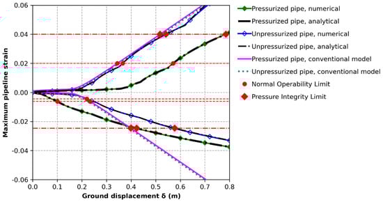 Figure 5 shows a comparison between the numerical and analytical model results assessing the performance of the pressurized and unpressurized pipelines in terms of the maximum axial strains for tension and compression, as a function of the ground displacement δ. Overall, the peak pipe strain magnitudes in the tensile and compressive PGD zone increase monotonically with the ground movement, progressively reaching the NOL and PIL performance limit states at critical values of ground displacement δcr,i, based on the operating conditions (Table 4).