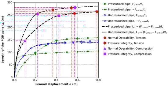 Figure 7 and Figure 8 show the maximum pipe strain magnitude as a function of the ground deformation demand (δ, Lb), for the pressurized and unpressurized pipelines, respectively, highlighting the critical PGD values (δcr,i, Lcr,i) corresponding to the achievement of the performance limit states.