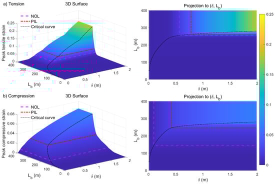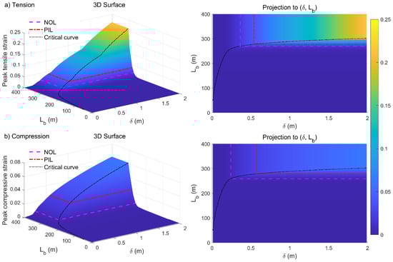The peak axial strain magnitude in the pressurized pipeline (Pi/Pmax = 0.75, ΔT = 50 °C) as a function of the PGD length Lb and displacement δ for (a) tension and (b) compression. The dashed horizontal curves represent the strain isolines corresponding to the NOL and PIL performance limit states.