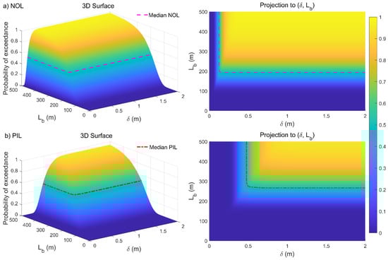 Fragility surface of buried pipeline (Hc = 1.5 m) for (a) Normal Operability Limit (NOL) and (b) Pressure Integrity Limit (PIL).