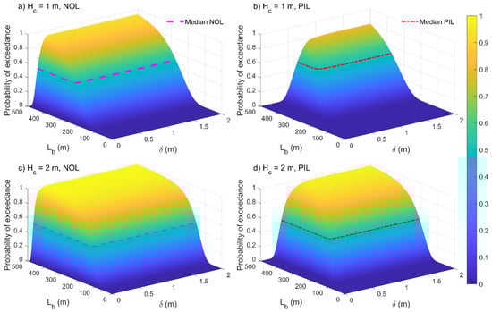 Fragility surface of buried pipeline for different cover depths and performance limit states: (a) Hc = 1.0 m, NOL; (b) Hc = 1.0 m, PIL and (c) Hc = 2.0 m, NOL; and (d) Hc = 2.0 m, PIL.