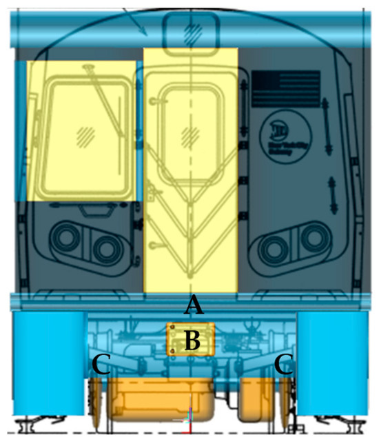 MADYMO multibody model of an R160 subway train. A = anticlimber, B = coupler, and C = wheels.