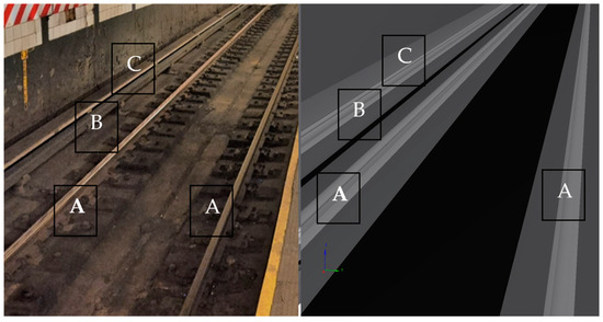NYC flat track bed with no crossties (image taken by the author) and multibody model. A—running rail, B—third rail (live), and C—third rail guard.