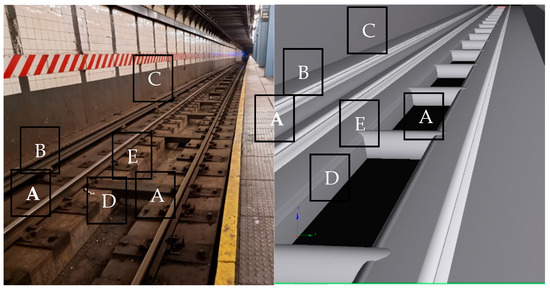 NYC track bed with drainage trough and crossties (image taken by the author) and multibody model. A—running rail, B—third rail (Live), C—third rail guard, D—drainage trough (suicide pit), and E—crosstie.