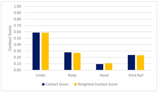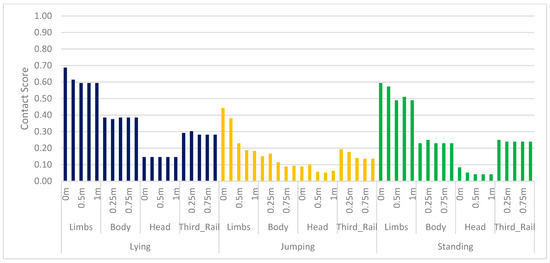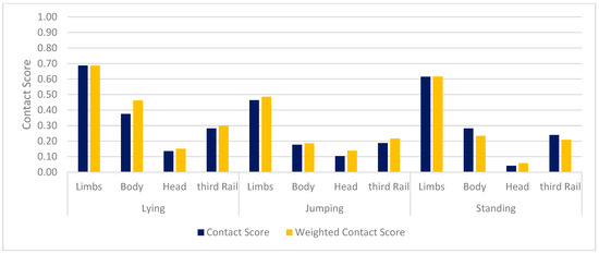 Figure 6 shows the BSTS contact and weighted contact score separated by impact conditions. Lying has the highest weighted contact score (WCS) across all regions while jumping IS show a relatively lower WCS for the limbs compared to lying or standing. The third rail contact scores are 0.2–0.3 for all impact positions.