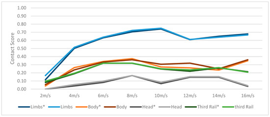 Figure 7 shows that impact velocity has a marginal influence on contact scores. Impact velocities between 6 and 16 m/s show little to no change in contact scores. However, the contact score is significantly lower between 2 and 4 m/s. This may be caused by the complete absence of a run-over due to the emergency braking of 1.43 m/s2. This suggests that train–pedestrian impacts pose similar run-over risks independent of the impact velocity at speeds above 4 m/s. A recent study found that the most common impact velocity on the NYC subway was 12 m/s [26]. This suggests that this impact velocity must be decreased to below 4 m/s before any substantial benefit will be found in reducing pedestrian–wheel contact injuries. Given the passive nature of the pedestrian models, the lower velocity (<4 m/s) contact scores are likely an overestimation as no active avoidance manoeuvres are made by the pedestrian model. During a real pedestrian collision at 2 m/s, sufficient time might be available to physically manoeuvre into a more advantageous position. At higher impact velocities, the ability to move out of the path of the wheels is less likely.