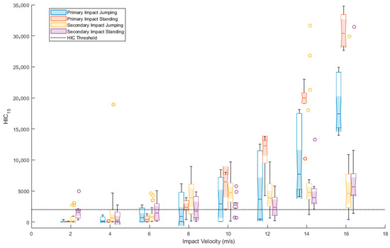 Figure 8 shows the range of primary and secondary HIC15 scores for the BSTS. The shaded region shown in each box and whisker plot represents the 95% confidence interval of the median value. The jumping ISs result in the highest range of HIC15 scores, while the standing ISs show a smaller range but higher HIC15 values. Secondary contacts show similar HIC15 scores in both jumping and standing and a lower dependency on impact velocity. HIC15 scores above the 2000 threshold correspond to a greater than 88% probability of AIS4+ head injury.