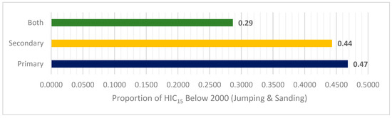 Figure 9 shows that 29% of the jumping and standing impacts result in a HIC15 score of less than 2000 for both primary and secondary impacts. This implies that countermeasure design must incorporate both primary and secondary impact mitigation to be effective.