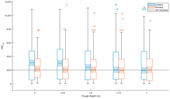 Figure 11 shows the effect of drainage trough depth on secondary contact HIC15 score for jumping and standing scenarios. There are only small changes in the median HIC15 score with each increment in trough depth, but a significant difference with 95% confidence for jumping can be found when comparing HIC15 at 0 m and 1 m trough depth. The significance level is based on a normal distribution assumption.