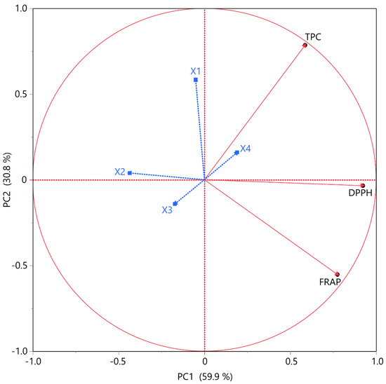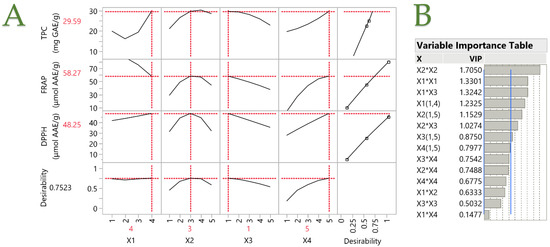 | FRAP | Y = 13.88 − 13.93X1 − 5.92X2 + 34.77X3 + 24.33X4 − 2.7X12 − 2.05X22 + 0.79X32 − 4.69X42 + 5X1X2 − 0.27X1X3 + 2.69X1X4 − 6.44X2X3 + 4.96X2X4 − 5.32X3X4 | 0.9901 | 0.9623 | 0.0005 | (7) |
