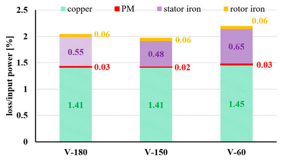 Bar graphs of the stacked losses as a fraction of the input power for the three designs are presented in Figure 5. This shows that the majority of losses are due to the stator copper losses, followed by stator iron losses, and there are only a small amount of rotor iron and magnet losses. It should be highlighted that the number of turns per phase of the V-60 is about 25% less than the other designs. This reduction enables the use of a conductor with a larger cross-sectional area, which in turn helps achieve lower resistance. Consequently, the stator resistance of the V-60 design is 0.036 Ω, compared to 0.065 Ω in the other designs. Although the winding resistance of V-60 is lower, its copper losses are approximately equal to the other designs because of its higher rated current.