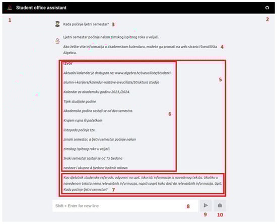 The main interface components and their functions within the SMAC virtual assistant application are presented in Figure 2. The interface is initiated with the (1) Title and Logo linked to the university’s official website, enhancing the user experience by providing a recognizable branding element. A (2) GitHub Link is provided to direct users to the project’s GitHub repository, where the source code and technical documentation can be accessed for transparency and further exploration. The question entered by the user is displayed in the User Query field, which initiates interaction with the virtual assistant. In contrast, the response generated by the assistant is shown in the Answer to Query section. The combined input, including context, model instructions, and the user’s question, is contained within the (5) Full Query box, which the VERTEX AI API subsequently processes. The literature snippets retrieved using the RAG method are provided by a (6) Source field, ensuring that responses are grounded in contextually relevant information. Instructions regarding the assistant’s role and the user’s question are incorporated into the (7) Model Query, guiding the model in response generation. Inquiries may be entered by users in the (8) “Question” Form, a dedicated text input field, and submitted via the (9) “Send” Button, which facilitates the transmission of the query to the server for processing. Finally, the (10) “Clear” Button is designed to enable the deletion of the displayed query history from the interface, thereby ensuring that the workspace remains organized and accessible for new interactions. A user-friendly workflow is supported by this comprehensive layout, with engagement enhanced through the virtual assistant while ensuring that responses are both relevant and well documented.
