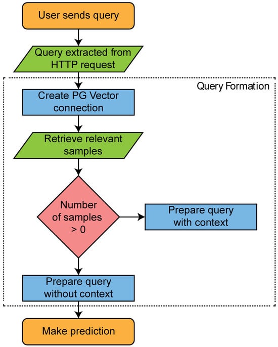Moreover, it has been observed that the system leverages semantic search capabilities, allowing for the detection of nuanced relationships between terms and concepts, thereby making retrieval more aligned with user intentions. Accuracy is improved, and retrieval latency is reduced, which allows for a prompter response from the system. Figure 3 illustrates the implementation of the RAG method, outlining the workflow for query formation and contextual response generation.