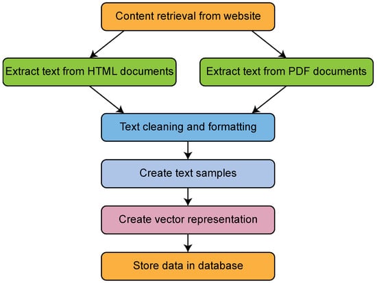 As the study outlines, the data preparation process is characterized by a systematic and rigorous approach to data acquisition from various sources, particularly on web pages and PDF documents. This method ensures the reliability and quality of the data. The data is initially stored in plain text format to ensure uniform processing. Once acquired, the raw data undergoes a comprehensive refinement process to eliminate extraneous and potentially distracting content. This cleaning stage includes removing non-essential elements such as headers, footers, personal names, and redundant information that may be repeated across multiple pages. Irrelevant or repetitive data, such as headers, footers, and hyperlinks that do not contribute to informational value, is deleted. Text alignment and spacing are ensured for readability. Furthermore, the removal of any personal information is conducted to ensure privacy, and the simplification of complex or redundant tables is achieved through the reorganization of data into smaller, semantically meaningful chunks. A vector representation is then assigned to each chunk for efficient retrieval based on semantic similarity, ensuring that essential information remains accessible in a more user-friendly format.
