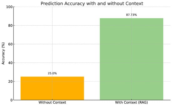Integrating context within query predictions is crucial for improving the virtual assistant’s accuracy and reducing the rate of hallucinations. The model is aided by contextual data, which grounds responses in relevant information, thereby minimizing the potential for misleading answers. The RAG method is relied upon in this approach, with contextually relevant documents being retrieved from a pre-defined database. Testing revealed that relevant context dramatically enhances response accuracy, with 65 out of 74 questions (87.73%) correctly answered by the VA when pertinent context is provided through RAG, as can be seen in Figure 5: