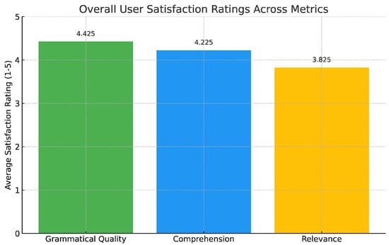 The testing results provided insights into the strengths and areas for refinement of the VA. Correct responses were generated by the VA for 85 out of 1210 questions, resulting in a percentage of 77.27%. The level of user satisfaction was notably high regarding grammatical and syntactic quality, with an average score of 4.425 recorded. This metric indicated that the clarity and professionalism of the VA’s responses were found to enhance trust in its functionality among users. The average score for query comprehension was recorded at 4.225, indicating that it was generally perceived that the VA understood the questions posed by users and appropriately addressed their queries, as shown in Figure 8: