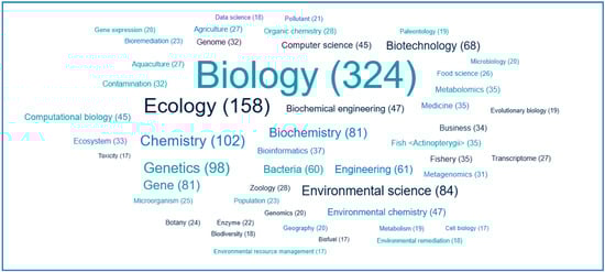 The research areas were evaluated according to the Journal Citation Report (JCR) assignments. The most allocated JCR subject categories were (i) biology, (ii) ecology, and (iii) chemistry. The omic technology and aquatic food products were linked with these fields (Figure 2).