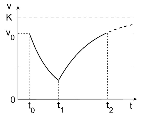 v t = v 0 · e t t 0 T 1 ,             t t 0 , t 1 v 0 · e t 1 t 0 T 1 + K v 0 · e t 1 t 0 T 1 · 1 e t t 1 T 2 ,           t t 1 , t 2