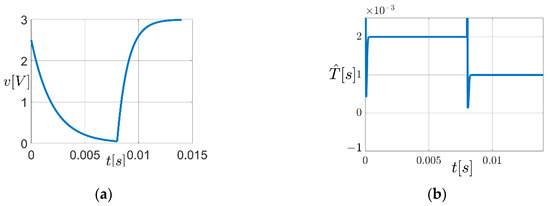 Figure 3. The behavior of the system in Figure 2 when v ( t ) has the Equation (7): (a) input signal; (b) the estimated time constant   T ^ t .