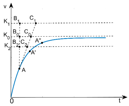 In practical applications, the correct use of PO2 requires an accurate estimation of the value of K related to the applied signal v ( t ) . As a motivation of this statement, Figure 5 is considered. The exponential in the figure has the equation K · e t / T with K = K 0 The parameter T being constant, its value is equal to the length of the subtangent corresponding to the current point A on the exponential curve, i.e., to the segment B 0 C 0 measured on the asymptote v t = K 0 . When A changes its position, successively passing through the positions A and A , the length of the subtangent does not change. If we wrongly consider for the same exponential that the asymptote is in another position, i.e., that the parameter K has a value different from K 0 , the property is no longer preserved. Thus, if we consider K = K 1 > K 0 the length of the subtangent, B 1 C 1   is greater than the subtangent B 0 C 0 ; moreover, as A passes through the positions A , A , …, it increases tending to infinity. If we consider that K = K 2 < K 0 , the length of the subtangent B 2 C 2 is smaller than the subtangent B 0 C 0 . When the exponential reaches the value   K 2 the length of the subtangent takes the value   0 , and then disappears.