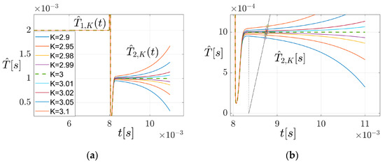 The effect of the additional term in (9) is illustrated in Figure 6. In Figure 6a are displayed more characteristics of the type such as that in Figure 3b, of parameter K , generated by PO2 when the signals of Equation (7) were applied to its input with K 2.9 , 2.95 , 2.98 , 2.99 , 3 , 3.01 , 3.02 , 3.05 , 3.1 . The group includes the K   = 3 case. With T ^ 1 , K ( t ) we denote the segments of T ^ ( t ) on the time interval on which v t decreases and with T ^ 2 , K ( t ) the segments corresponding to the time interval on which v t increases. The latter are detailed in Figure 6b. All estimates T ^ 1 , K ( t ) overlap and stabilize at the value T ^ 1 = 2 · 10 3   s . This is explained by the fact that in processing the decreasing variations of v t PO2 does not use the value of K . Among the curves T ^ 2 , K t , only the curve T ^ 2,3 ( t ) stabilizes at the correct value T ^ 2 = 10 3   s . All other curves fail to stabilize. After the damping of the transients that appears starting from the moment t = 0.8 · 10 3   s they have either a monotonically increasing or a monotonically decreasing shape, as K takes values lower or higher than the value 3.