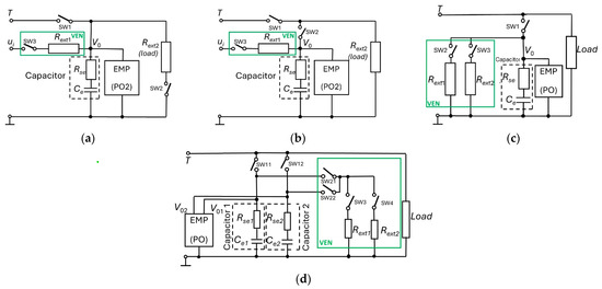Figure 7. Principle schemes used for the realization of DC-DC buck converters with the estimation of the equivalent parameters of the filter capacitors: (a,b) Schemes with the monitoring of the discharging and charging of the capacitor using PO2 (c,d) Schemes with monitoring of two distinct discharges using PO.