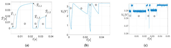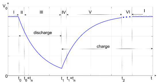 Figure 8 illustrates the V 0 ( t ) signal in an estimation cycle associated with a discharge/charge process corresponding to the schemes in Figure 7a,b. During the I interval, the schemes operate in DC-DC mode. In intervals III and V, PO2 estimates the equivalent time constants. In intervals II and IV, of duration t n , PO2 acquires the voltage V 0 ( t ) but does not calculate T ^ 1 e and   T ^ 2 e . The VI interval corresponds to a transient regime of DC-DC mode restoration. Table 2 shows the sequence of switch states and regimes for an estimation cycle of the scheme in Figure 7a.