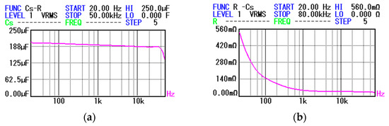 Figure 10. Frequency characteristics of the filter capacitor C 2 of the converter in Figure 9: (a) C ( f ) characteristic; (b) Characteristic R s ( f ) .