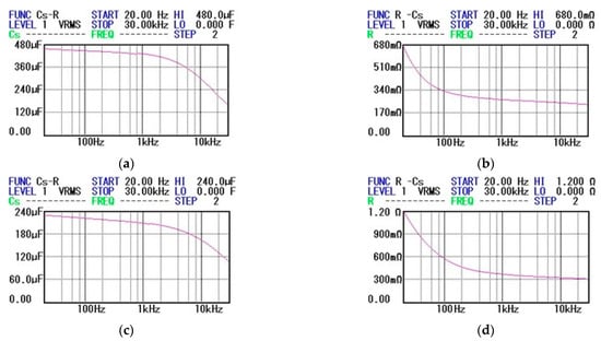 Figure 13. Frequency characteristics of the filter capacitors in Figure 12: (a,b) C ( f ) and R s ( f ) characteristics of the electrolytic capacitor C 21 ( 470   μ F / 25   V ) ; (c,d) C ( f ) and R s ( f ) characteristics of electrolytic capacitor C 22 ( 220   μ F / 25   V ).