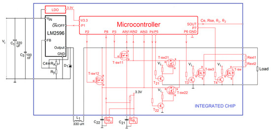 Figure 15. Integrated circuit diagram associated with the DC-DC buck converter in Figure 12. The integrated chip includes 6 switches (T-swij, i,j = {1,2}; T-swi, i = {3,4}), the LM2596 circuit, the LDO circuit, and the microcontroller. The unembedded components are the filtering capacitors C 21 , C 22 , the VEN resistors   R e x t 1 ,   R e x t 2 , the temperature sensors, the inductance L1, and the input capacitors C 1 , C 2 .
