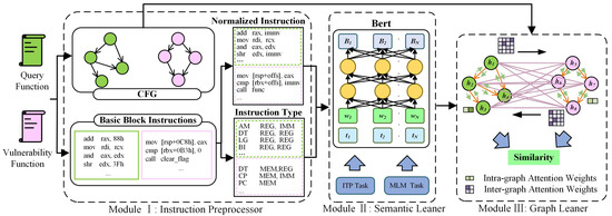Remarkable advancements in deep learning technologies [5] have revealed enormous potential in natural language processing (NLP), speech recognition, and computer vision [6]. Researchers have successfully applied deep learning to the detection of binary homologous vulnerabilities, yielding significant research outcomes [7,8,9,10,11]. Among these, the graph matching network (GMN) model [9] utilizes both intra-function semantic information and inter-function differences to compute similarity scores, achieving notable detection accuracy. GMN employs attention mechanisms to extract pivotal information for assessing functional homology. However, this approach restricts the attention mechanism to inter-function matching, potentially overlooking critical semantic information during intra-function graph convolution. Moreover, current methods often treat the disassembled instructions as natural language, neglecting their unique characteristics and limiting the accuracy of vulnerability detection.