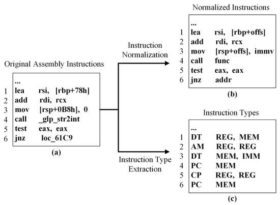 An example of instruction normalization and instruction type extraction. (a) Original assembly instructions; (b) Normalized instructions; (c) Instruction types.