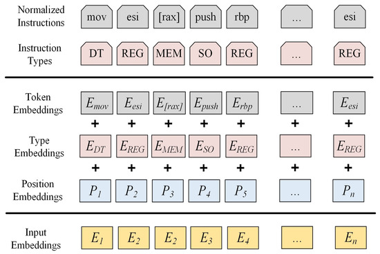 In GMN+, each opcode or operand from the normalized instruction corpus is uniquely represented as a token along with its associated type. The input to the BERT model consists of two sequences: a normalized instruction sequence with n tokens and a corresponding instruction type sequence detailing the types of each token . Similar to the methodology of BERT, three types of embeddings are constructed for each token: token embedding, type embedding, and position embedding. These embeddings are summed to form a comprehensive input embedding for input tokens. Figure 3 illustrates the construction of BERT input embeddings by summing the token, type, and position embeddings for each instruction code and operand in the normalized instruction sequence.