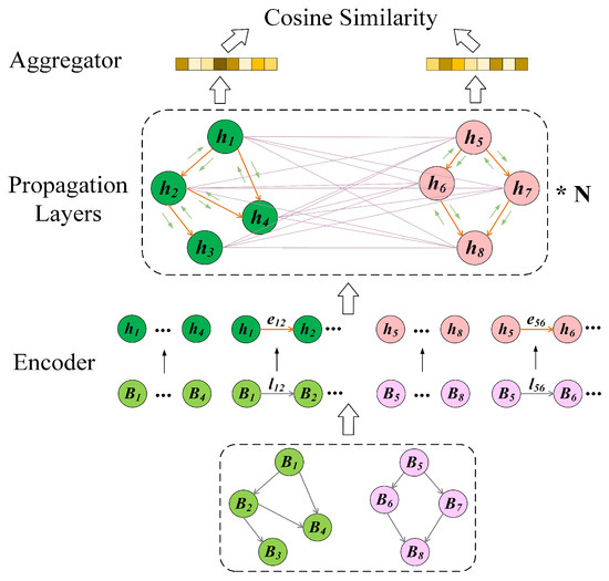 Figure 4 provides an example that illustrates the process of Graph Learner, with which the similarity between functions based on the ACFG is calculated. In this process, the Encoder encodes each function’s nodes and edges. Then, Propagation Layers generate updated node embeddings using enhanced attention. Finally, the Aggregator aggregates these node embeddings to produce the graph embeddings used for computing function similarity.