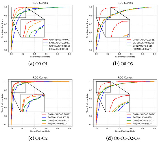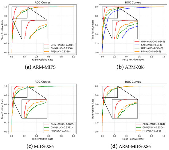 This experiment assessed GMN+ alongside baseline methods in detecting similar function pairs across various architectures with a balanced 1:1 ratio between positive and negative sample pairs, which were all optimized at level O1. These methods were evaluated on recall, precision, and F1 score with detailed results in Table 7. ARM-MIPS, ARM-X86, and MIPS-X86 represent function pairs involving only two architectures, while ARM-MIPS-X86 denotes function pairs that involve three architectures simultaneously. Since the SAFE lacks support for the MIPS architecture, its experimental results are limited to ARM-X86. The results indicate the superior performance of FIT, GMN, and GMN+ over SAFE, which was possibly because SAFE merely focuses on the semantic information of instructions without considering the structural information of functions, whereas the other methods incorporate structural insights. The FIT performs better than the GMN model, which is possibly due to its use of NLP techniques to extract significant semantic features from basic blocks, whereas GMN primarily utilizes rudimentary code statistics for basic block characterization. Among the models tested, GMN+ demonstrated superior performance, especially in the most challenging scenario (ARM-MIPS-X86), achieving the highest recall, precision, and F1 scores of 0.9835, 0.9321, and 0.9571, respectively. Figure 5 illustrates the ROC curves of the proposed GMN+ and baseline models. It can be seen that GMN+ (highlighted in red) consistently outperforms the baseline methods, achieving the highest area under the curve (AUC). These results demonstrate the superior efficacy of GMN+ across varied architectural conditions.