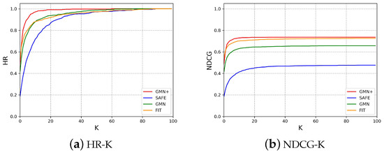 A homologous function search involves identifying functions within a designated pool that share homology with a query function. The performance of GMN+ and the baseline methods was evaluated using HR-K and NDCG-K. For each function in the test set, we constructed a pool consisting of one randomly selected homologous function version and 100 non-homologous functions to assess the similarity rankings of the homologous function relative to the pool. The results are shown in Figure 7. The horizontal axes represent the number of top results evaluated, denoted as K, and the vertical axes give the Hit Rate (HR) and Normalized Discounted Cumulative Gain (NDCG), respectively. As can be seen from Figure 7, for K ≤ 40, the HR values for GMN+ surpassed those of the baseline methods, whereas for K > 40, the HR values for all methodologies converged toward 1. Similarly, GMN+ also achieved the highest NDCG-K. These results demonstrate the superior capability of GMN+ in homologous function search tasks compared to baseline methods. The distinct advantage of GMN+ over baseline methods arises from its advanced modeling of both structural and semantic aspects of code. GMN+ enhances homologous function search by effectively integrating various data modalities, such as the code structure and the semantic aspects of instructions, particularly by incorporating instruction type information into the model.