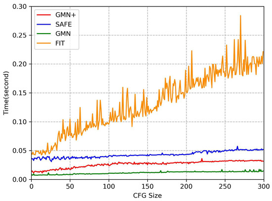 This experiment evaluated the time costs of function homology detection for GMN+ and baseline methods on different function sizes, i.e., the number of basic blocks. The primary time cost components involve generating function embeddings and calculating similarity scores. The results depicted in Figure 8 show the distinct time costs associated with different methods, where the horizontal axis represents the CFG size and the vertical axis represents the time cost of detection. The time costs of FIT are significantly higher than those of the other methods, escalating linearly with CFG size. The higher time costs for FIT stem from its use of LSTM to generate basic block embeddings, which are computationally intensive. The SAFE method, which uses a bidirectional RNN to aggregate instruction embeddings into function embeddings, incurs slightly higher time costs than the graph embedding method used by GMN+. GMN+ demonstrates marginally higher time costs than GMN due to its integration of an additional attention mechanism. Moreover, the application of NLP methods to automatically generate basic block embeddings, characterized by heightened dimensions, also increases the computation time of GMN+.