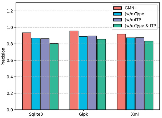 These models were evaluated using three datasets constructed with functions from Sqlite3, Glqk and Xml software. The results are shown in Figure 9 where the vertical axis represents the average detection precision. GMN+, (w/o) Type, (w/o) ITP, and (w/o) Type & ITP achieved average precision values of 0.9367, 0.8780, 0.8687, and 0.8317, respectively, across different datasets. GMN+ consistently achieved the best performance in different datasets, demonstrating the significance of integrating instruction type and executing ITP during pre-training.