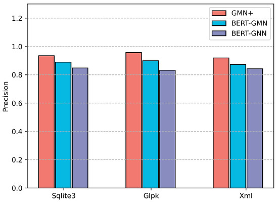 We further evaluated two versions of our model, BERT-GNN and BERT-GMN, which substitute the GMN with enhanced attention with standard GNN and GMN, respectively. As illustrated in Figure 10, where the vertical axis represents average detection precision, BERT-GMN outperformed BERT-GNN. This improvement is attributed to the graph matching mechanism employed by GMN, which builds upon the foundational GNN structure to effectively perceive differences between nodes, enhancing similarity detection. Meanwhile, GMN+ outperformed the BERT-GMN model because GMN+ incorporates an additional graph attention mechanism to focus on nodes containing significant semantic information within the CFG.