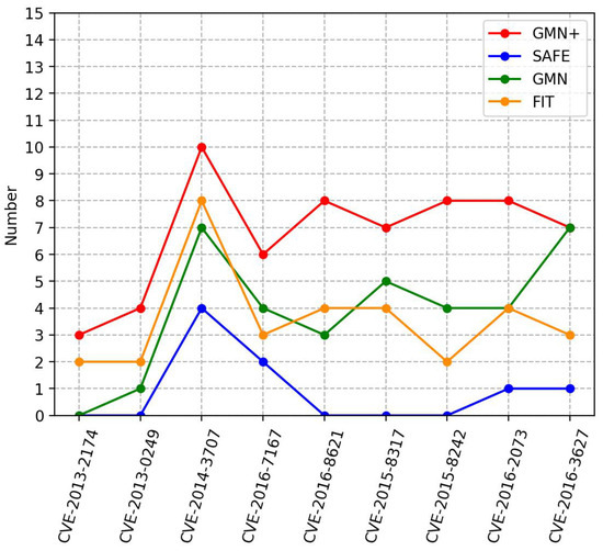 To address RQ3, we collected nine real CVE vulnerability functions from two software packages, as detailed in Table 9. Each software was compiled across three architectures (ARM, MIPS, X86) and four optimization levels (O0, O1, O2, O3), producing 12 versions that constituted a function pool of 27,714 functions. For each vulnerable function, a version for the X86 architecture at optimization level O1 was selected as the query function. Its similarity to other functions in the pool was assessed and ranked. The number of functions with homologous vulnerabilities within the top 10 highest similarities is illustrated in Figure 11, where the horizontal axis represents specific CVE identifiers. The experimental results reveal that GMN+ surpasses all baseline methods in detecting real-world vulnerabilities. Specifically, GMN+ identified 61 vulnerable functions (within the top 10) in total, in contrast to 32 by FIT, 35 by GMN, and 8 by SAFE. The reasons for superior performance of GMN+ in real-world vulnerability detection align with the benefits seen in the function similarity detection task, underscoring the efficacy of our method.