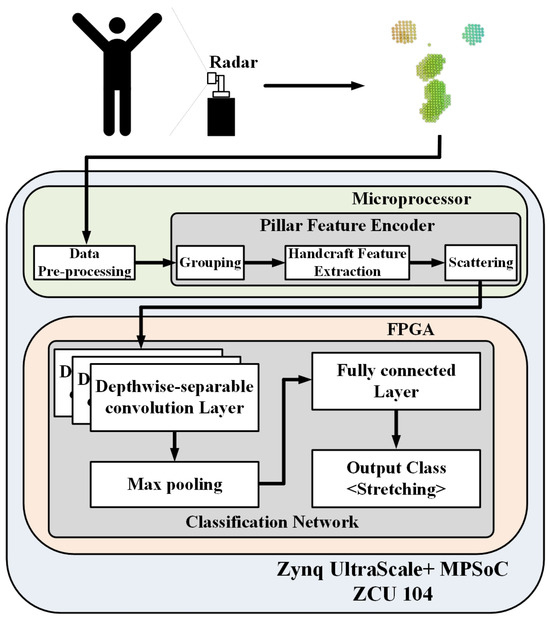 To design a low-power and lightweight HAR system, first, we designed the HAR system with a 32 bit floating-point format in a GPU environment. Subsequently, the classification network was quantized to a 4 bit fixed-point format for lightweight, and the memory usage was reduced to 12.5% of the original 32 bit floating-point format network. Finally, for a low-power design, the HAR system was hardware–software designed on a heterogeneous computing platform, ZCU104 [23]. Figure 3 shows an overview of the proposed HAR system. The point-cloud data obtained by the radar are input into the microprocessor, and pre-processing is performed on the input point-cloud data. The pre-processed point-cloud data are input to the PFE and converted into a 2D pseudo image by grouping 3D point-cloud data, creating handcraft features and scattering. The converted 2D image is input to the classification network IP implemented on a field-programmable gate array (FPGA), and the activity class is inferred and output through deep-learning operations based on depth-wise separable convolution.