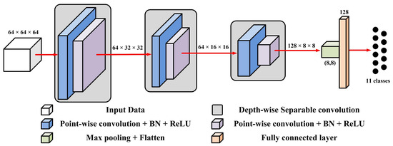 The backbone network structure of the proposed HAR system is shown in Figure 4. When a 2D image of size 64 × 64 with 64 channels was input, it was converted to an 8 × 8 image with 128 channels using three depth-wise separable convolution layers. It was then passed through max pooling and the fully connected layer to classify the 11 classes of human activity.