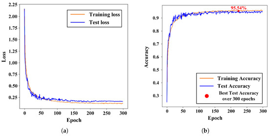 The loss curve and accuracy curve for training and testing after 300 epochs of training are shown in Figure 5, where NLL loss is used as the loss function. The loss decreased significantly in the early epochs of training and tended to decrease moderately after approximately 50 epochs. Similarly, the accuracy increased significantly in the early epochs of training and tended to increase and maintain a moderate rate after approximately 50 epochs.