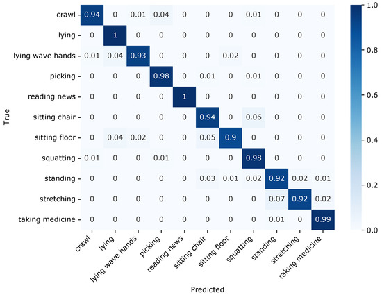 The confusion matrix for the HAR system using our dataset is shown in Figure 6. The sitting floor class tended to be confused with the lying, lying wave hands, and sitting chair classes. This is because the sitting floor class is similar to the sitting chair class in terms of sitting motion and is similar to the lying class in terms of being close to the ground.