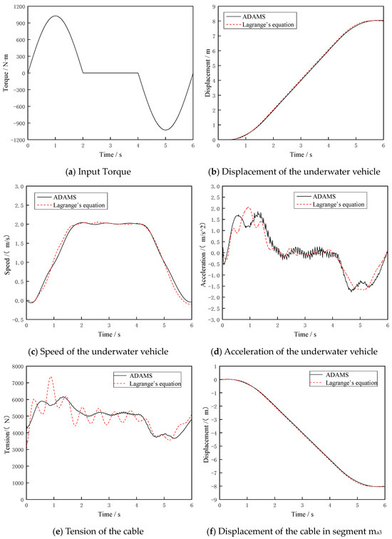 For validation, the method presented in this paper and the ADAMS software applied the same torque at the drive wheel, and the distance between the towing wheel and the guiding wheel was set to 40 m, while a tension of 3500 N was applied to the cable. The displacement, velocity, and acceleration were compared to analyze the errors between the two methods. The parameters used in the validation of the Lagrangian equation are shown in Table 2. These parameters are derived from an actual physical project and represent data obtained through on-site measurements during project implementation. In this study, the ODE45 function in MATLAB was used to solve differential equations. ODE45 employs a fourth- to fifth-order Runge–Kutta algorithm, where the fourth-order method provides a candidate solution and the fifth-order method controls the error. This adaptive (variable-step) numerical solution method is used to integrate the differential equations of the variable coefficient cyclic towing system. The calculation flowchart is shown in Figure 4. In the commercial software ADAMS, the discrete model of a cyclic towing system is established using the parameterized integration module cable. The parameters for the cable in the model are set as follows: diameter of 17 mm, length of 40 m, Young’s modulus of 6 × 109 N/m2, density of 970 kg/m3, and an element count of 200. The contact parameters between the cable and pulley are defined as: contact stiffness of 104 N/mm, force exponent of 1, damping coefficient of 0.1, and friction coefficient of 0.6. The dimensions of the pulleys are set as follows: the driving pulley has a diameter of 0.8 m, and the guiding pulley has a diameter of 0.7 m with a width of 50 mm and depth of 20 mm. When applying external load fluid resistance, although ADAMS software lacks a dedicated module for fluid resistance calculations, this can be achieved by treating the fluid resistance as a unidirectional force applied to the center of mass of the underwater vehicle [18]. Since fluid resistance is related to the vehicle’s speed, the software can monitor the speed of the underwater vehicle, substitute it into the fluid resistance formula, and then apply the calculated force to the model’s center of mass. The simulation time is set equal to the operating time of the underwater vehicle. The solver employs the GSTIFF method, with an integration error and a time step set to 0.001 and 0.01 s, respectively.