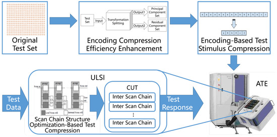 Among the aforementioned challenges, the increase in testing costs has garnered substantial attention and concern from researchers. Increased transistor density necessitates extensive structural, functional, and parametric tests. The iterative updates of ATE struggle to keep pace with the advancements in integrated circuit manufacturing processes. During testing, the number of test channels and the test bandwidth are constrained by the physical limitations of the test equipment, resulting in limited data transmission rates [15,16]. Given the larger number of test patterns required, efficient test stimulus compression techniques are crucial. Test stimulus compression methods, as an effective means to shorten test time, directly impact the efficiency and cost of integrated circuit testing [17] and have been widely applied in chips with multi-chiplet integration. The advantages of its application can be summarized as follows: