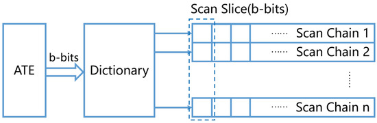 Reddy’s [36] method based on multi-scan chain structure for complete dictionary encoding is shown in Figure 3. The scan chains for testing consist of n chains, and every clock cycle inputs an n-bit segment into the scan chains. In dictionary encoding, each scan slice is filled according to the principle of the fewest segment types and stored in the dictionary. The index count in the dictionary is , where N is the number of segment types after the scan slice is filled. The more scan chains, the more bits in the scan slices and the shorter the test time. However, the complete dictionary encoding method is limited by the number of segment types after filling, and the more types there are, the more indexes there are and the higher the design complexity of the decoder, thus occupying more hardware resources.
