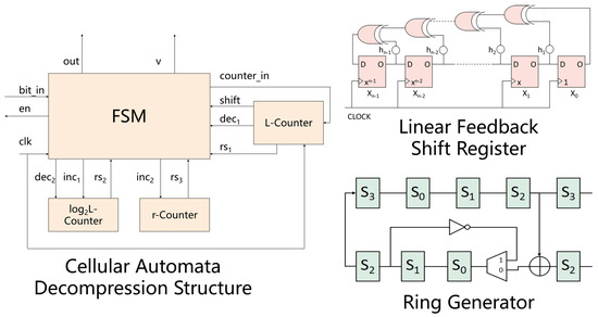 The first type of optimized scan chain structure is the linear decompressor, which is a combinational logic circuit consisting of XOR gates and flip-flops. Its output response space is a linear space formed by the expansion of a Boolean matrix [25]. Typical linear decompression structures include Linear Feedback Shift Registers (LFSR), Cellular Automata, and Ring Generators, as shown in Figure 4. Compared to LFSRs, RGs demonstrate enhanced encodability, albeit with an associated hardware overhead that translates to a chip area increase of up to 14% [26].